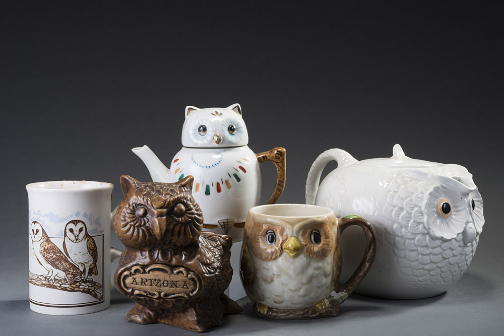 Lotto composto da cinque fra tazze e teiere raffiguranti gufi, una con...
