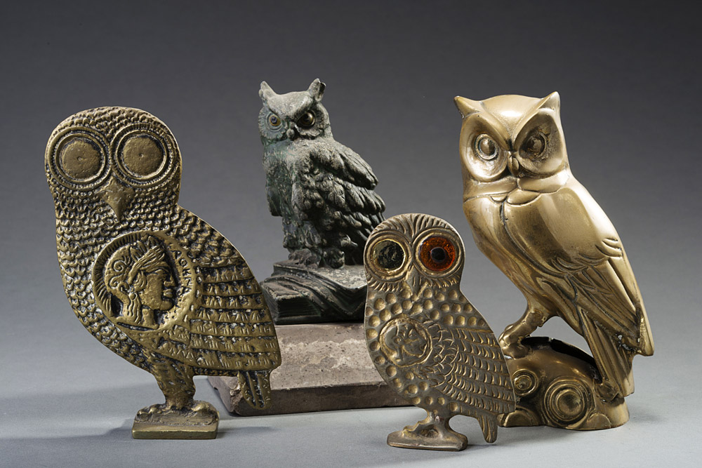 Lotto composto da quattro sculture in metallo raffiguranti gufi (difetti e mancanze) Lot comprising four metal owl sculptures (defects and losses)