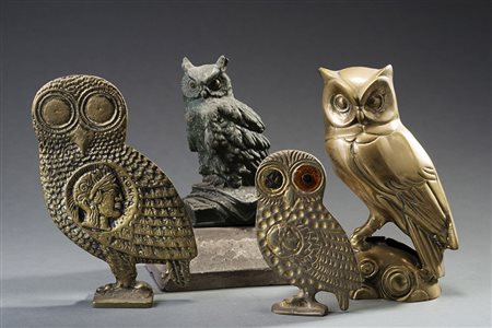 Lotto composto da quattro sculture in metallo raffiguranti gufi (difetti e...