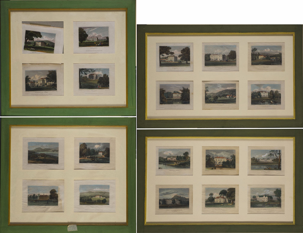 Gruppo di venti incisioni a colori raffiguranti paesaggi contenute in quattro cornici laccate Group of seven colour engravings of landscapes in four lacquered frames