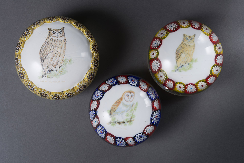 Lotto composto da tre press papier decorati con gufi e murrine Lot comprising three owl and murrine paper-weights