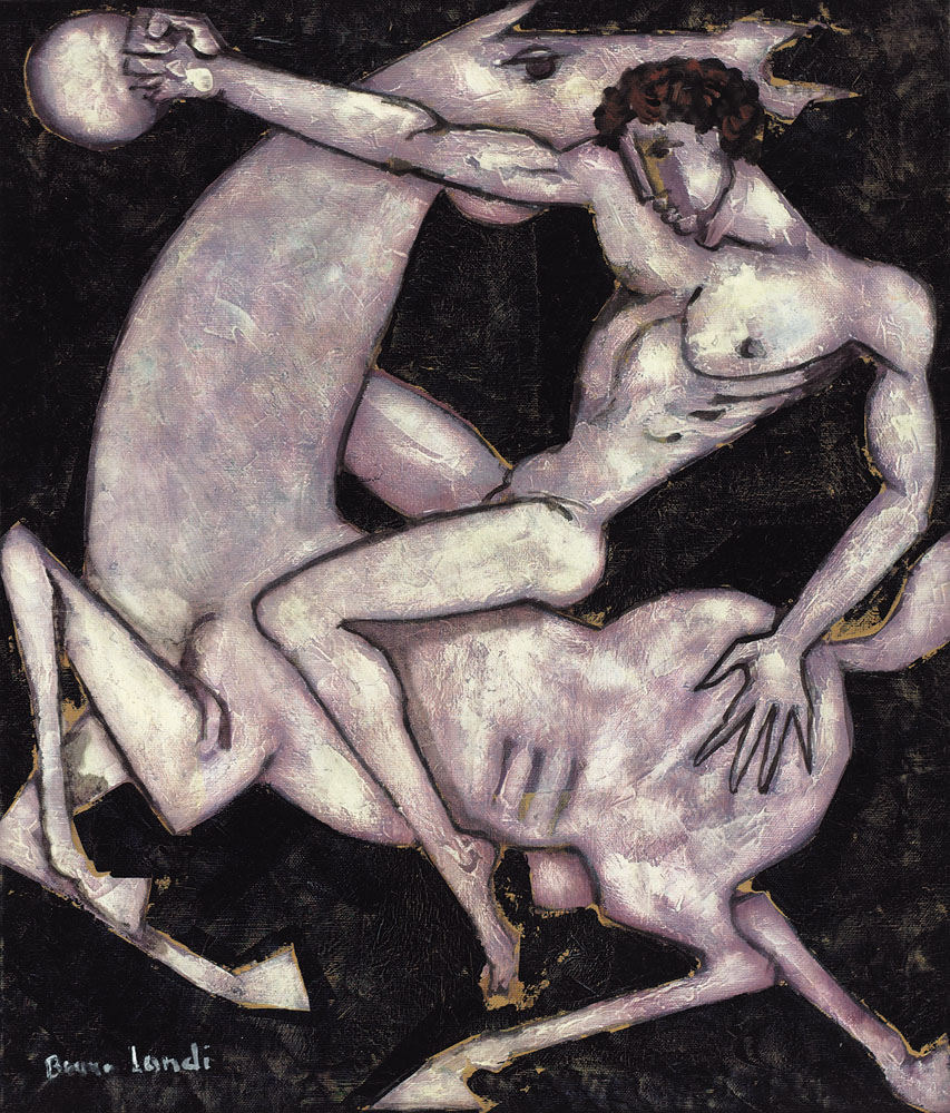 BRUNO LANDI Roma 23/03/1941 Cavallo e cavaliere, 1994 olio su tela cm. 60x51, firma in basso a sinistra, firma e dedica dell'artista al retro, dichiarazione d'autenticità dell'artista su foto, dichiarazione d'autenticità dell'artista e archivio della Meeting Art (VC) su foto, pubblicato sul Catalogo Generale delle Opere di Bruno Landi, primo volume, Editoriale Giorgio Mondadori, pagina 110.