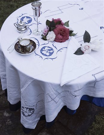 Tovaglia con ricamo e inserti a punto ago, sette tovaglioli di accompagno...