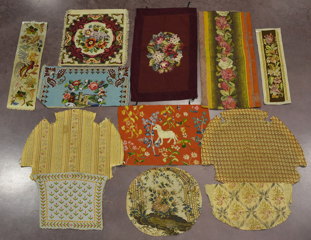 Lotto composto da dodici frammenti ricamati a piccolo punto e perline, forme...