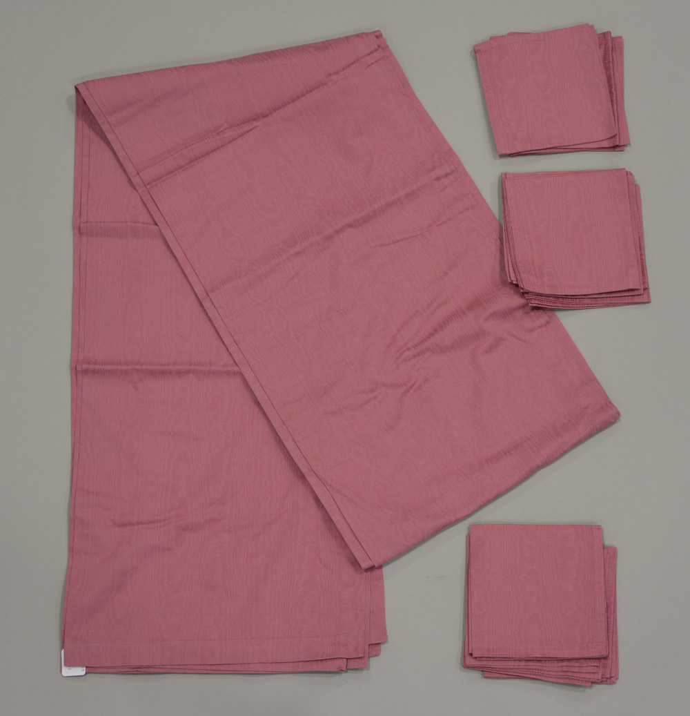 Lotto composto da una tovaglia rettangolare moiré color fucsia e sedici tovaglioli. Sec XX (cm 440x250 circa) (lievi difetti) lot comprising a rectangular moiré tablecloth and sixteen napkins, 20th century (minor defects)