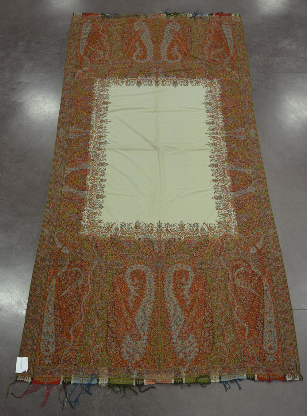 Scialle cachemire con centro bianco. Inizio sec.XX (cm 350x160) (lievi difetti) Cashmere shawl, early 20th century (minor defects)