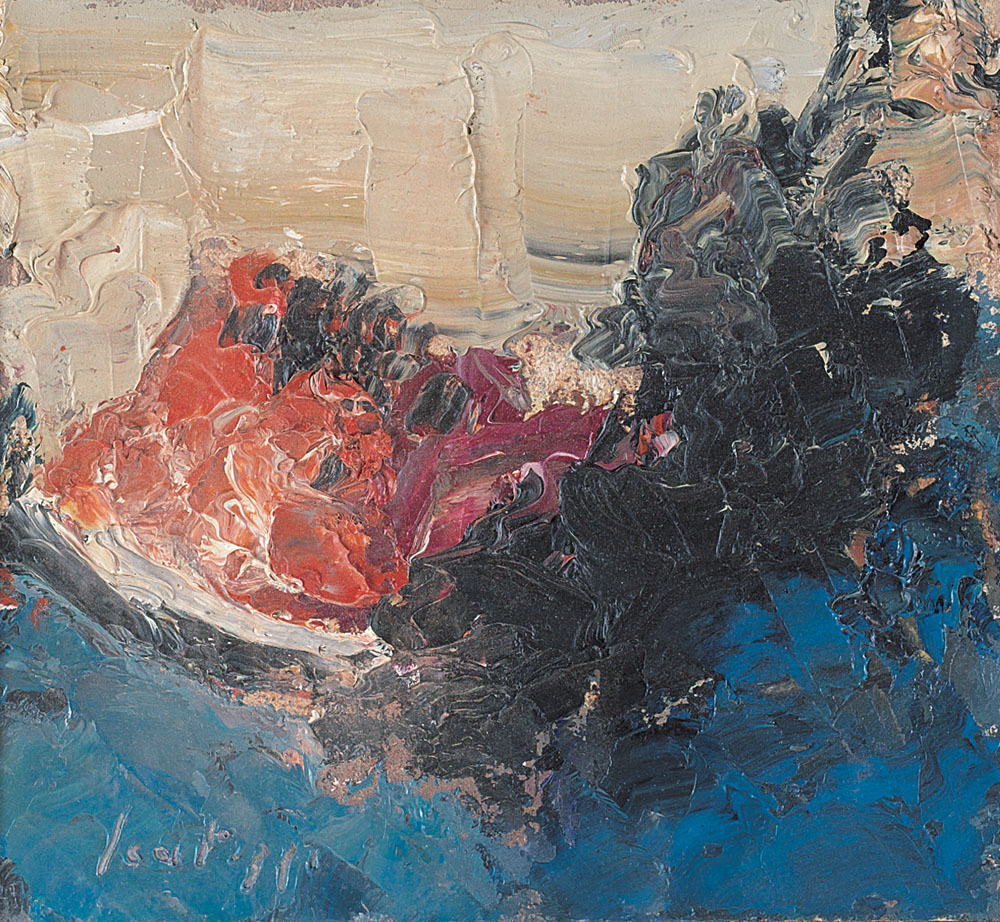 SERGIO SCATIZZI Gragnano (Lu) 20/12/1918 - Firenze 02/12/2009 Anguria e uva, 1991 olio su faesite cm. 28x30, firma in basso a sinistra, dichiarazione d'autenticità dell'artista e archivio a cura della Galleria il Fiore (Montecatini) su foto.