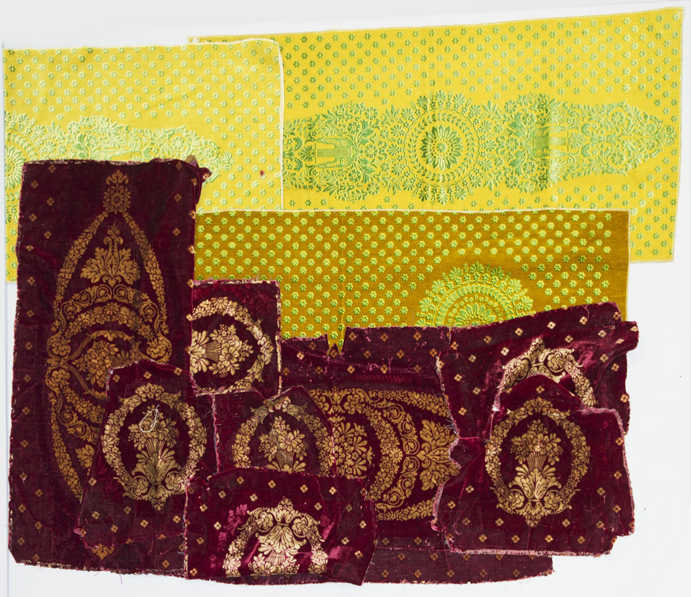 Lotto composto da dieci frammenti per rivestimento di panchette e sedie in velluto impresso stile impero con fondo bordeaux e ocra Sec. XX Lot comprising ten fragments of covers for banquettes and chairs, 20th century