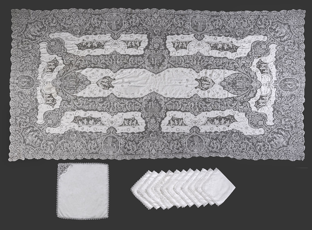 Tovaglia rettangolare in pizzo con inserti in cotone ricamato a rami fioriti ( cm. 350x180 ) completa di 12 tovaglioli Rectangular lace tablecloth with twelve napkins