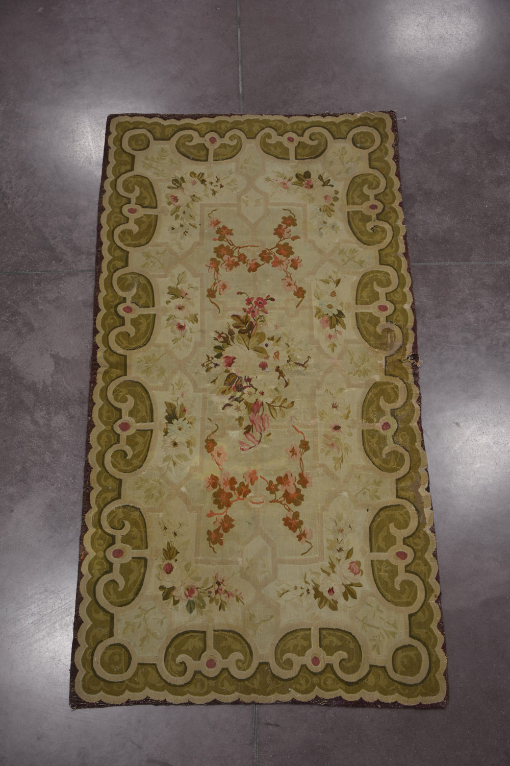 Tappeto Aubusson Francia sec. XIX disegno floreale su fondo beige (gravi difetti) (190x95) Aubusson carpet, France, 19th century (major defects)