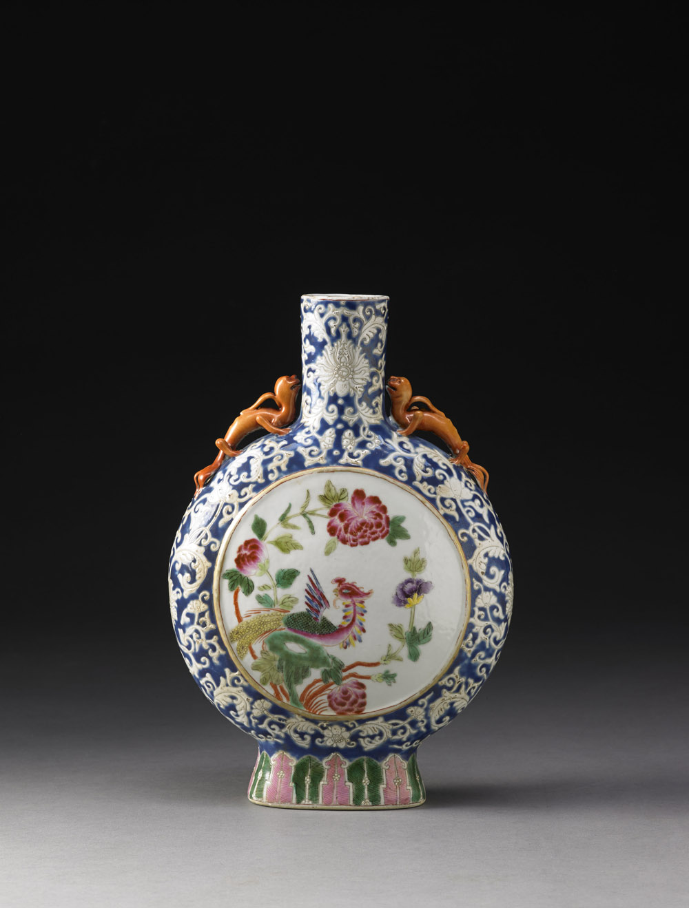 Vaso a fiasca baoyueping in porcellana decorato a smalti della Famiglia Rosa fencai a motivo di crisantemi in bianco su fondo blu ed entro medaglioni a motivo di peonia e fenice Cina, sec. XIX A Famille Rose baoyueping porcelain vase decorated with chrysanthemum and phoenix China, 19th century (h cm 31)
