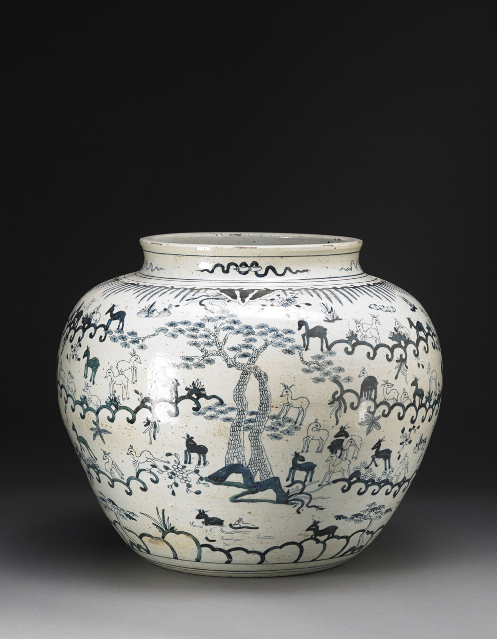 Grande giara in porcellana bianca e blu decorata in stile Ming con motivo classico dei cento cervi Cina, sec. XX. Altezza A blue and white porcelain jar painted in blue and white with the classic Ming-style decoration of the hundred deer China, 20th century (h cm 38)