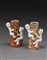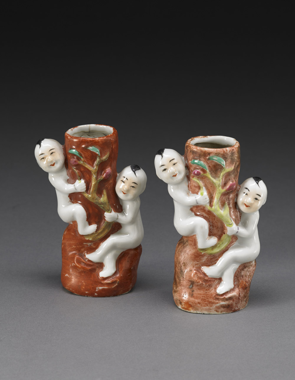 Coppia di piccoli vasi in porcellana policroma in forma di tronco d'albero e fanciulli arrampicati, piccole mancanze Cina, sec. XIX * Lotto assogettato a regime di IVA ordinaria A pair of small polychrome porcelain vases shaped as tree trunks with boys climbing onto it China, 19th century (h cm 11,5)