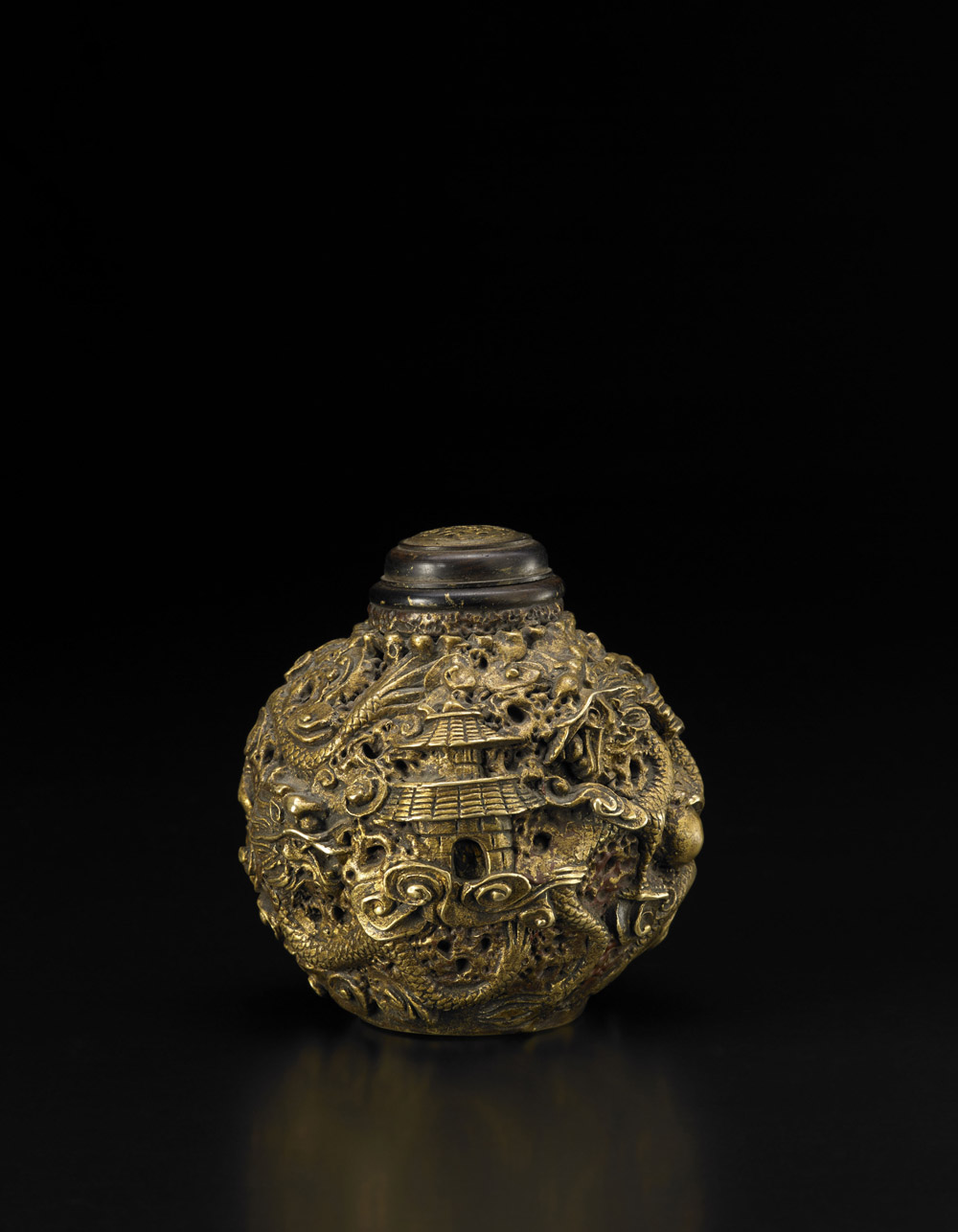 Piccolo contenitore in metallo brucia incensi, decorato all'esterno con draghi tra nuvole e pagode, il coperchio traforato, marchio illegibile alla base Cina, sec. XX * Lotto assogettato a regime di IVA ordinaria A small metal incense-burner vessel, decorated to the exterior with dragons amongst clouds and pagodas, the cover pierced, illegible mark to the base China, 20th century (h cm 9)