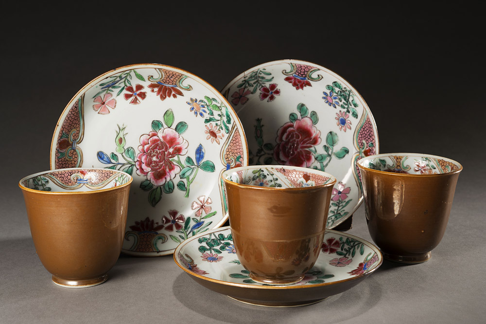 Tre tazze con piattini in porcellana café-au-lait decorate all'interno con fiori in Famiglia Rosa (lievi difetti) Cina, metà sec. XVIII Three cafè-au-lait cups and saucers decorated in Famille Rose to the interior (minor losses) China, second half of 18th century (tazze/cups h cm 7; piatti/saucers d cm 13,5)