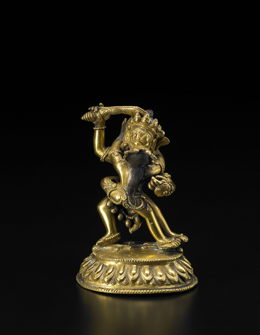 Piccola scultura in bronzo raffigurante due divinità in un abbraccio amoroso, entrambi con corone ad impreziosire il capo, in piedi su due servitori, su base con petali di loto Cina/Tibet, sec. XIX A small bronze group depicting two deities in an amorous embrace, both wearing elaborate crown on their heads, standing on two servants on a lotus base China/Tibet, 19th century (h cm 11.5)