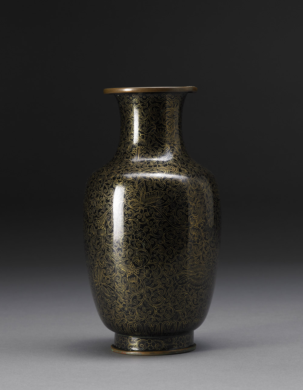 Vaso a balaustro in cloisonné, decorato con motivi geometrici dorati su luminoso fondo nero Cina, tarda dinastia Qing, fine XIX/inizio XX secolo A cloiosonné vase decorated with gilt geometric motifs on a black ground China, late Qing dynasty, late 19th/early 20th century (h cm 23)