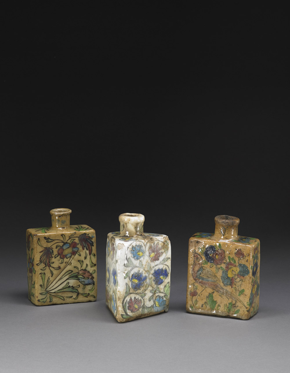 Tre bottiglie in terracotta decorata con smalti sottocoperta, due di forma rettangolare, una di forma triangolare Persia (Iran), XIX/XX secolo Three pottery bottles of rectangular and triangular shape, decorated in underglaze enamels Persia (Iran), late 19th/early 20th century (h max. cm 16,5)