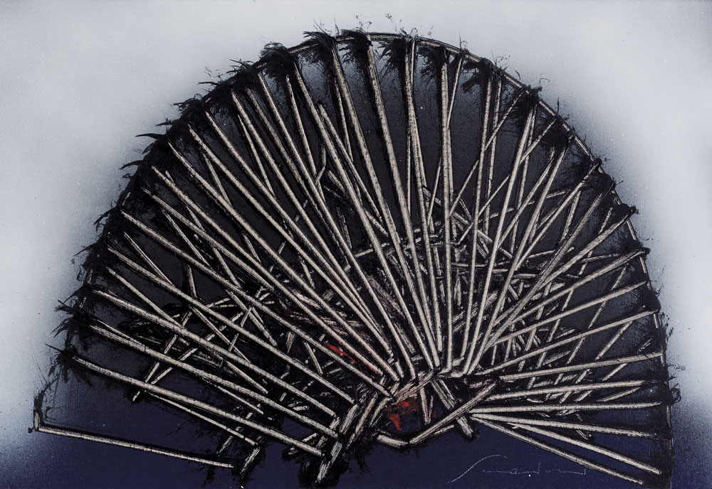 EMILIO SCANAVINO Genova 28/02/1922 - Milano 29/11/1986 Il ventaglio, 1982 olio su tela cm. 50x73, firma in basso a destra, titolo, firma, tecnica, etichetta e timbro dello Studio F22 (Palazzolo sull'Oglio-BS), dichiarazione d'autenticità della moglie Giorgina Graglia Scanavino su foto, pubblicato su "Scanavino, Catalogo Generale", volume secondo a cura di Giorgina Graglia Scanavino e Carlo Pirovano, Edizioni Electa (MI), pagina 838.