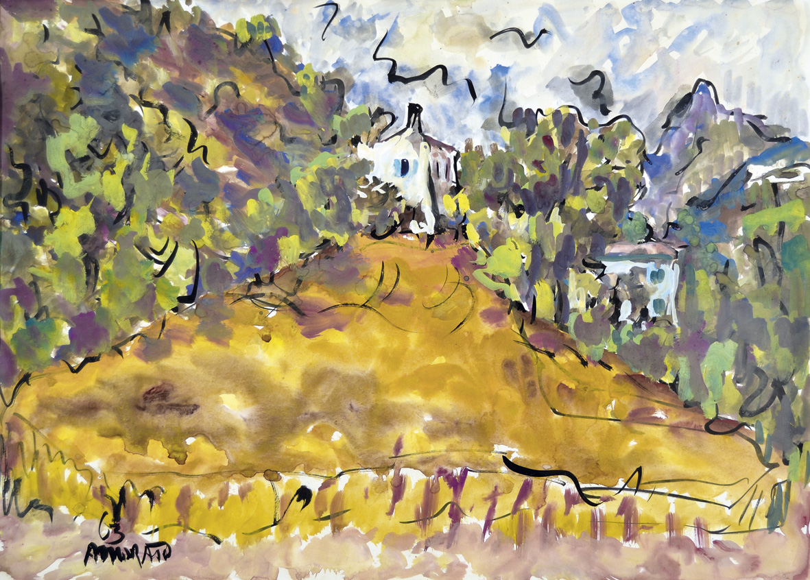 MORATO ANTONIO Este 1903 - Padova 1989 Paesaggio 1963 tempera su carta 50x70 firma e data in basso a sinistra