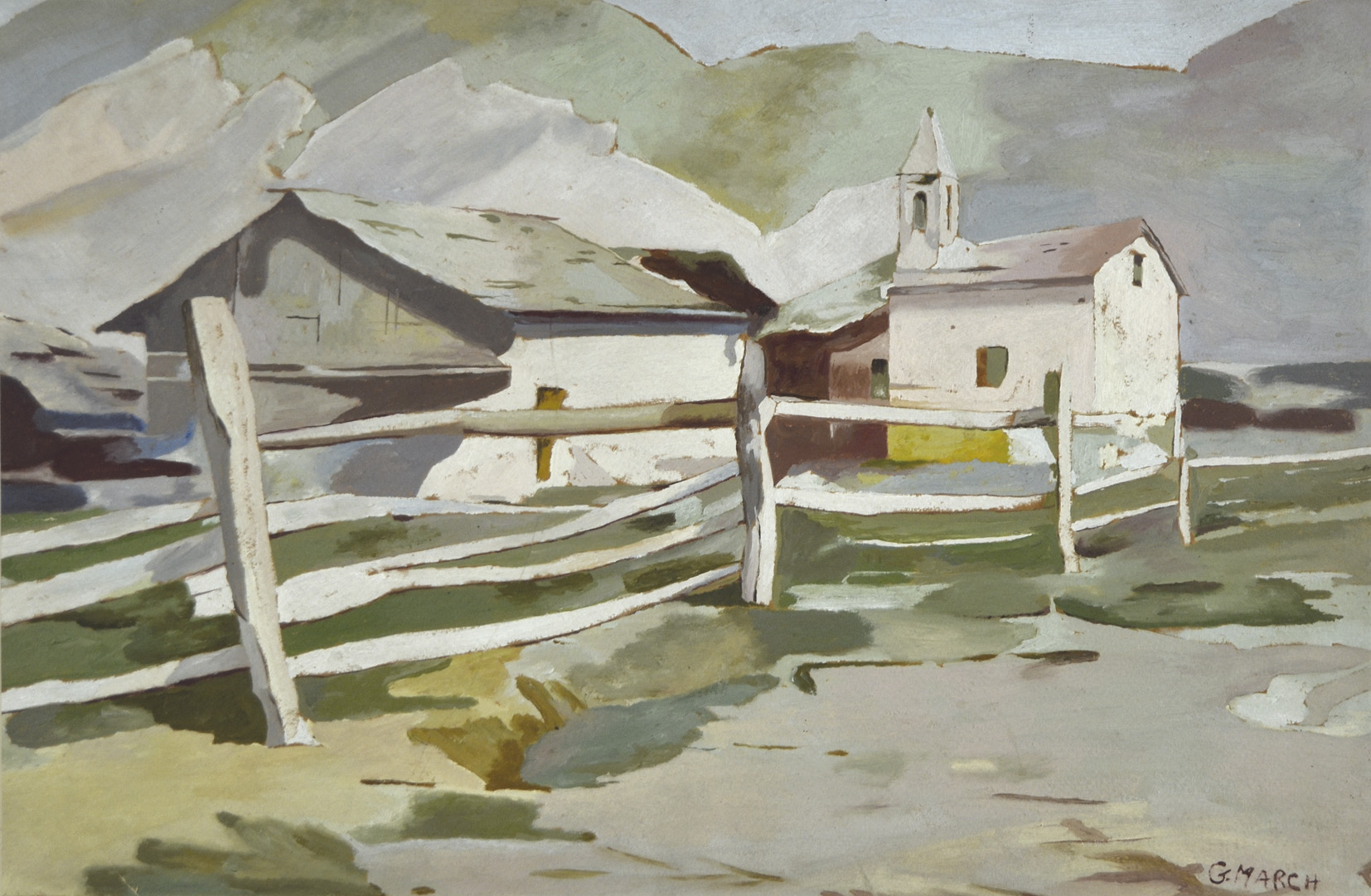 MARCH GIOVANNI Tunisi 1894 - Livorno 1974 Chiesa tecnica mista su carta 36x54 firma in basso a destra la carta presenta un leggero strappo in basso a sinistra