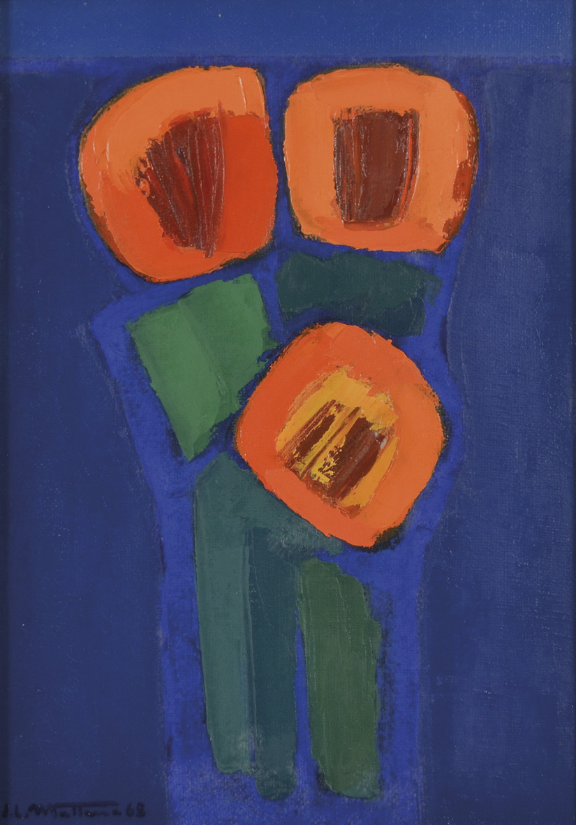 MATTANA JEAN LOUIS Francia 1921-1990 Fiori 1968 olio su tela 46x33 firma e data in basso a sinistra, firma e dedica ad personam al retro esposizioni: Galleria La Maggiolina Alessandria - etichetta e timbri al retro