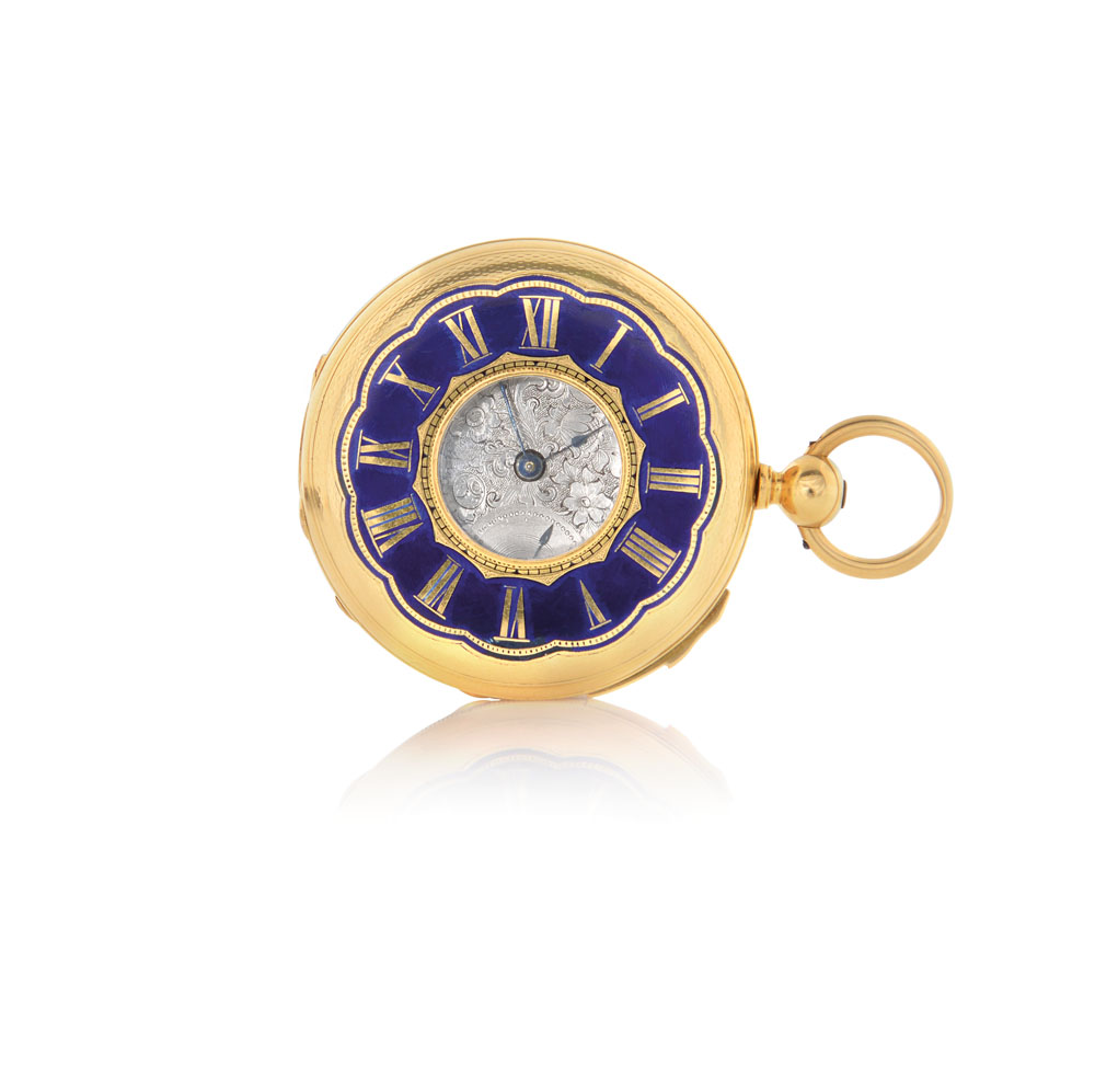C. half-hunter, 18K yellow gold and blue enamel with Roman numerals. D. silver with applied Roman numerals and subsidiary seconds. M. cylindre escapement, quarter repeating, key winding.