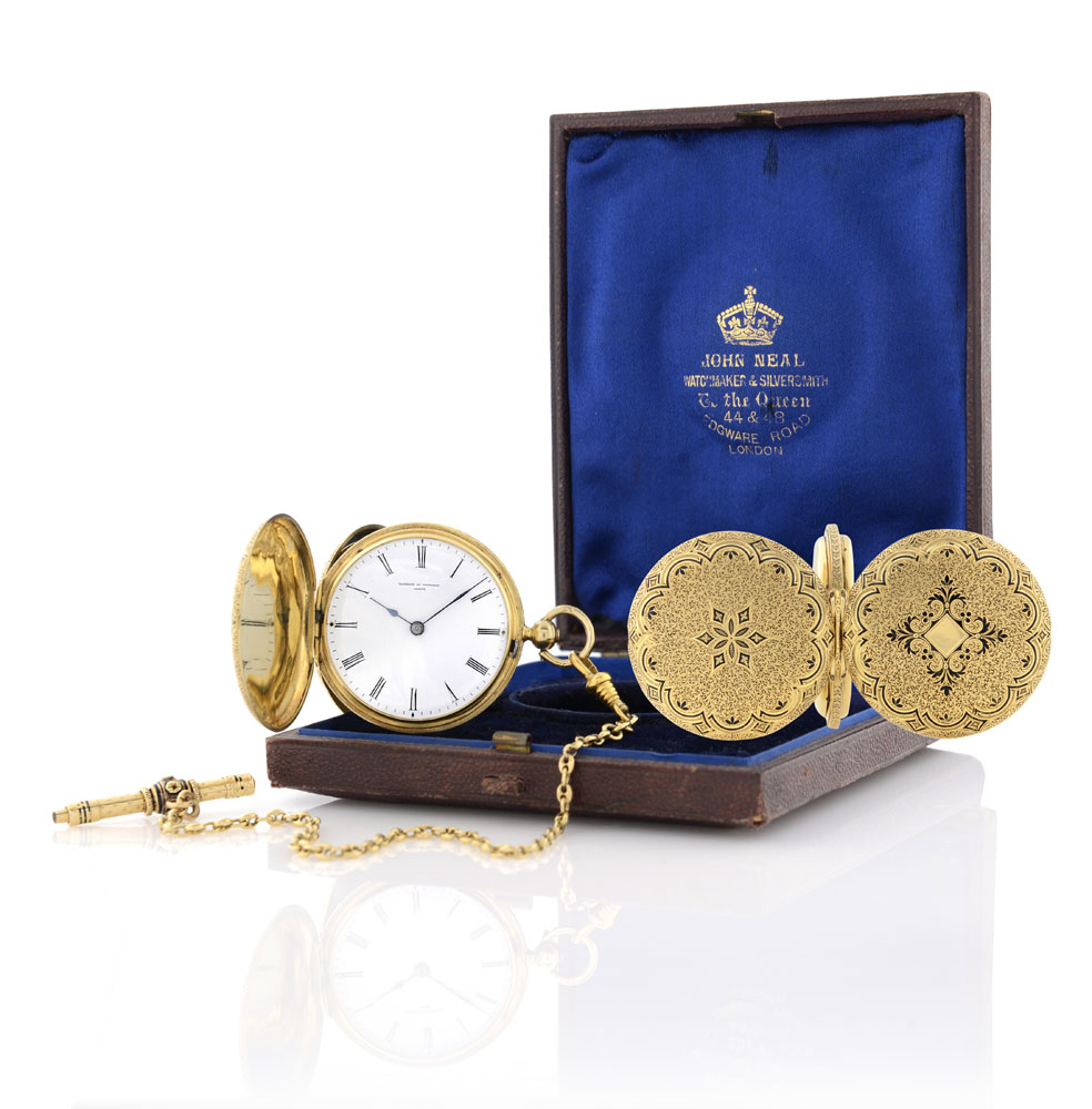 C. hunter case, 18K yellow gold totally engraved with black enamel decorations. D. white enamel with Roman numerals. M. anchor escapement, key winding. Dial, case and movement signed. Accompanied by yellow gold key with small chain and box.