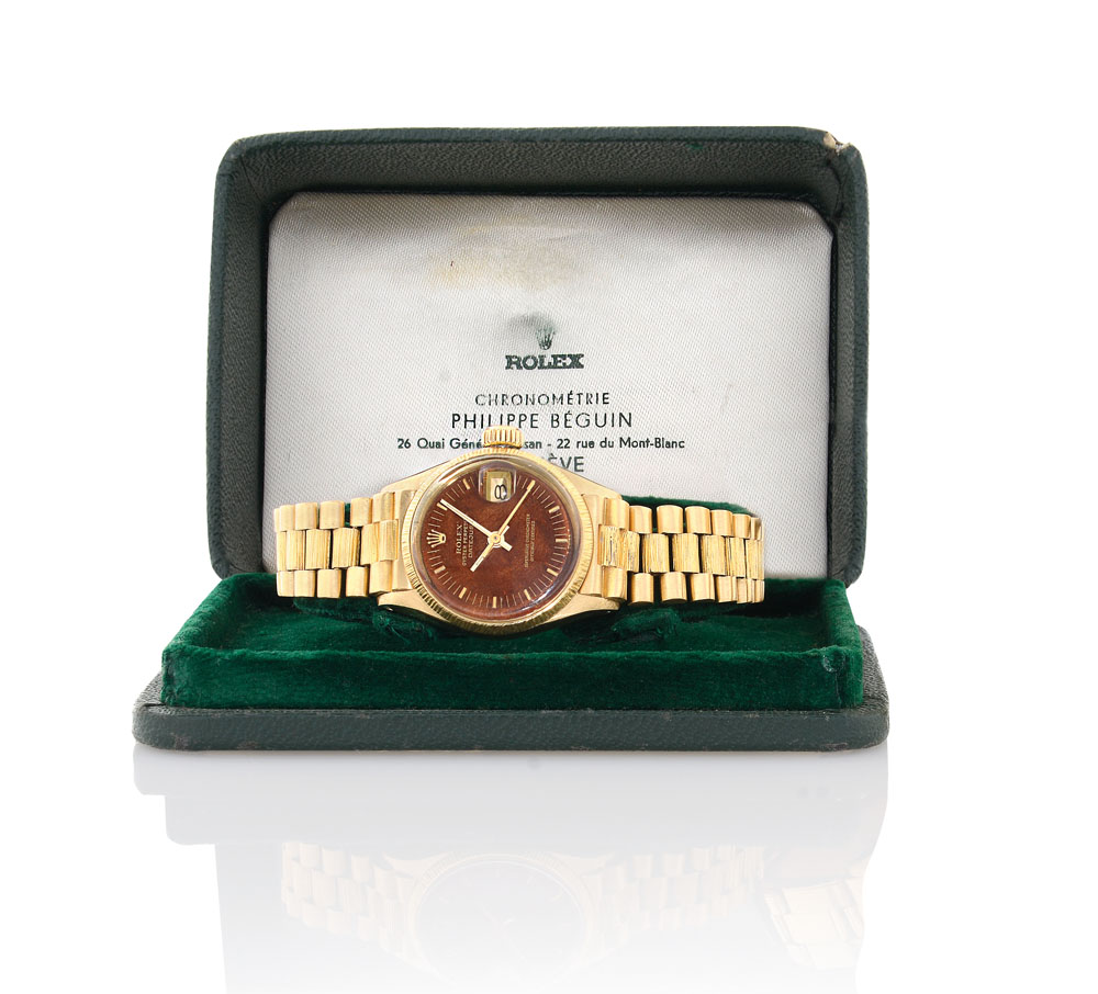 C. n. 1078395 in oro giallo 18 kt con fondello e corona a vite, lunetta a corteccia. Q. in radica con indici applicati, secondi al centro e data al 3. M. a carica automatica. Bracciale President in oro giallo 18 kt. Quadrante, cassa, movimento e bracciale firmati. Completo di astuccio originale.