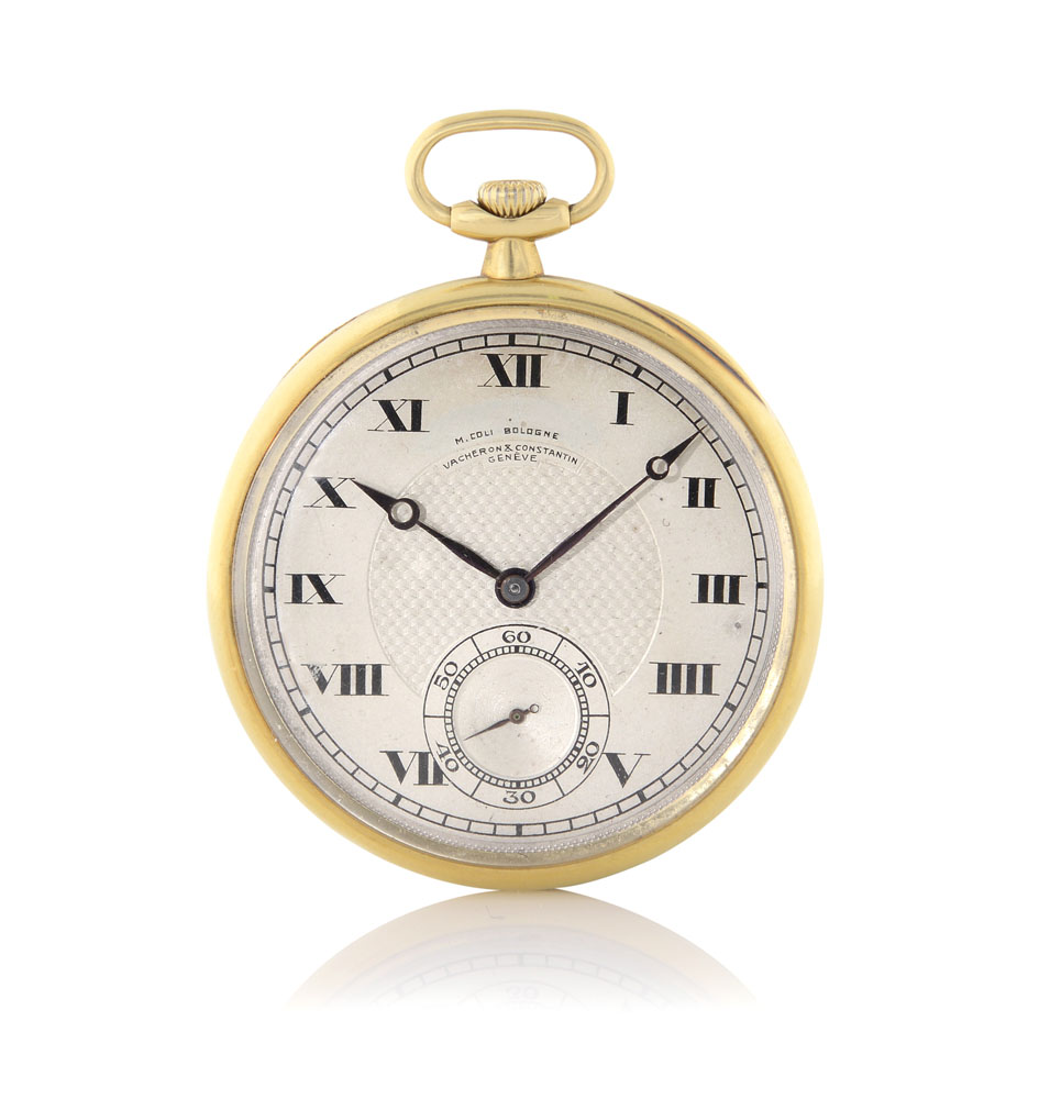 C. openface, smooth 18K yellow gold with inscription of 1934 engraved on the cover inside. D. silvered guillochè in the centre, Roman numerals and subsidiary seconds. M. rhodium finished, anchor escapement, keyless dress. Dial, case and movement signed.