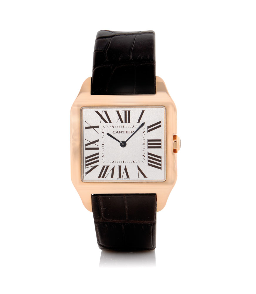 C. thin, 18K pink gold with case back secured by screws. D. silvered with painted brown Roman numerals. M. slim, manual winding. Dial, case and movement signed. Accompanied by Cartier strap, 18K deployante clasp, box and blank certificate.