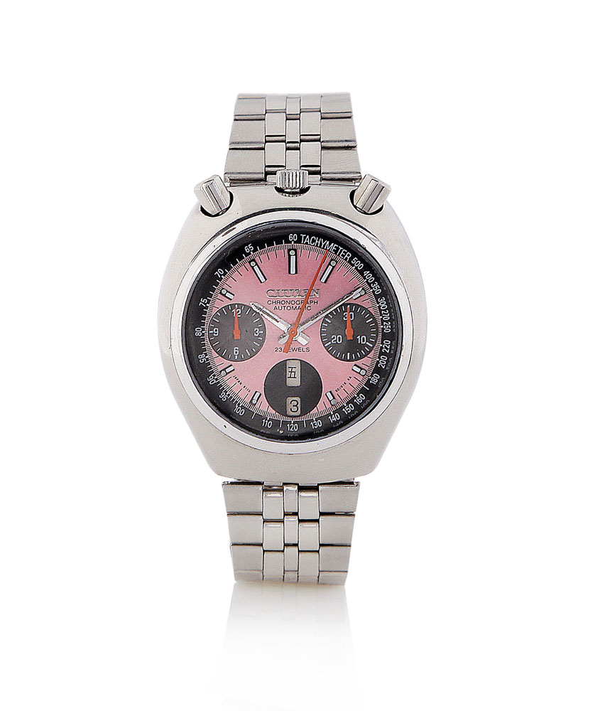 C. tonneau-shaped, stainless steel with screwed case back and round buttons at 1 and 11, sapphire crystal. D. bicolor pink and black with applied indexes, 30 minute and 12 hour registers, aperture for the day of the week and date at 6, outer tachymetre scale. M. self-winding. Stainless steel bracelet. Dial, case, movement and bracelet signed.