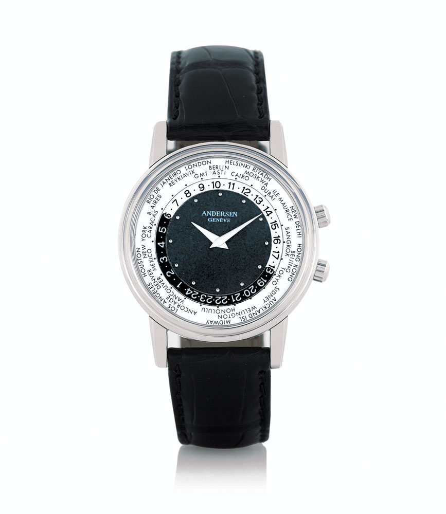 C. 18K white gold, downturned lugs, crowns at 2 and 4, inscription "Svend Andernsen pour G.R. piéce unique" engraved on case back. D. silvered and grey with cities of the world, applied indexes and outer rotating chapter ring calibrated for 24 hours and divided into diurnal and nocturnal hours. M. self-winding. Dial, case and movement signed. Accompanied by Svend Andersen 18K gold buckle and strap.