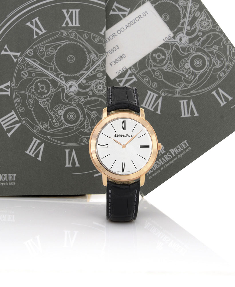 C. thin, 18K pink gold with transparent case back secured by screws, sapphire crystal. D. silvered with painted indexes and Roman numerals. M. manual winding. Dial, case and movement signed. Accompanied by Audumars Piguet strap, 18K pink gold buckle, box and certificate.