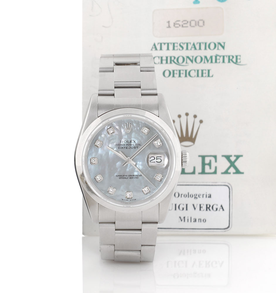 C. stainless steel with screwed case back and crown, smooth bezel and sapphire crystal. D. mother-of-pearl with diamond indexes, centre seconds and date at 3. M. self-winding. Stainless steel Oyster bracelet. Dial, case, movement and bracelet signed. Accompanied by Rolex box and certificate dated 10/1994.