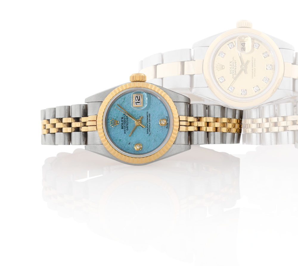 C. stainless steel and 18K yellow gold with screwed case back and crown, reeded bezel and sapphire crystal. D. light blue stone with applied diamond and yellow gold Arabic numerals, centre seconds and date at 3. M. self-winding. Stainless steel and 18K yellow gold Jubilè bracelet. Dial, case, movement and bracelet signed. Accompanied by Rolex box and certificate dated 09/2000.