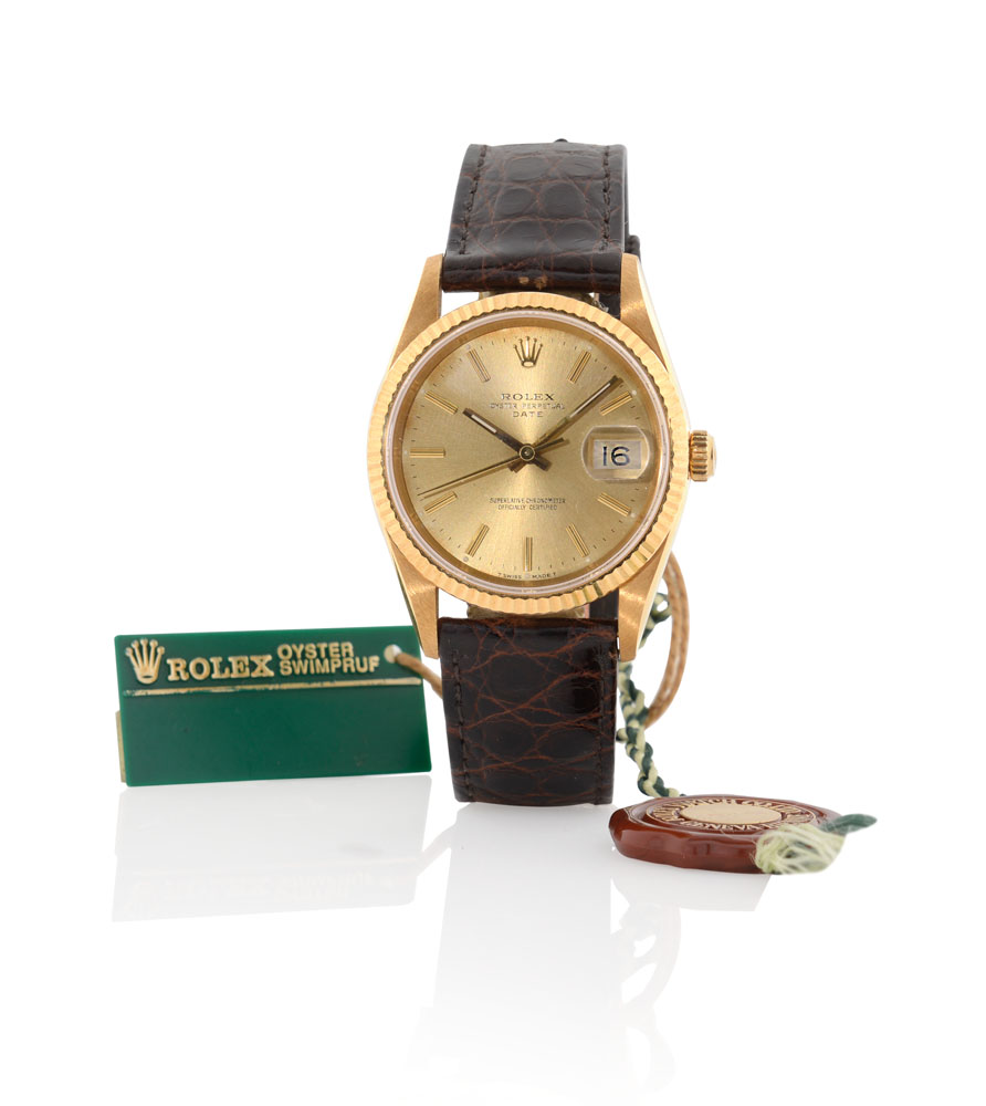 C. 18K yellow gold with screwed case back and crown, reeded bezel and sapphire crystal. D. champagne with applied indexes, centre seconds and date at 3. M. self-winding. Dial, case and movement signed. Accompanied by Rolex strap and 18K yellow gold buckle.