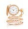 C. n. 65676 in oro rosa 14 kt incisa e carrura cannalè. Q. in smalto con numeri romani e secondi al 6. M. finemente inciso, chiuso per 3/4 con scappamento a verga, carica manuale. Quadrante e movimento firmati, cassa numerata. Completo di catena in oro rosa 18 kt.