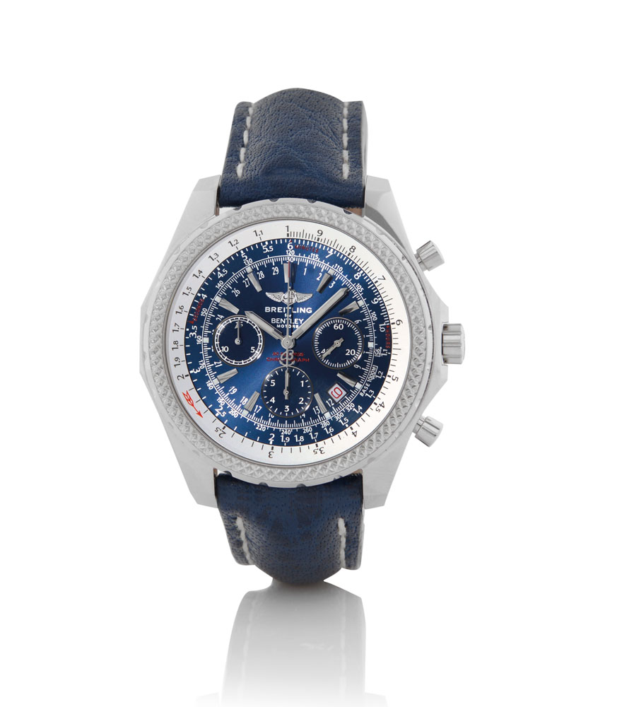 C. stainless steel with screwed case back, round buttons, milled bezel and sapphire crystal. D. blue with applied indexes, luminous hands, 15 minute and 6 hour registers, date between 4 and 5, outer tachymetre scale and rotating slide rule bezel. M. self-winding. Dial, case and movement signed. Accompanied by Breitling strap, stainless steel buckle, box, certificate and chronometer certificate.