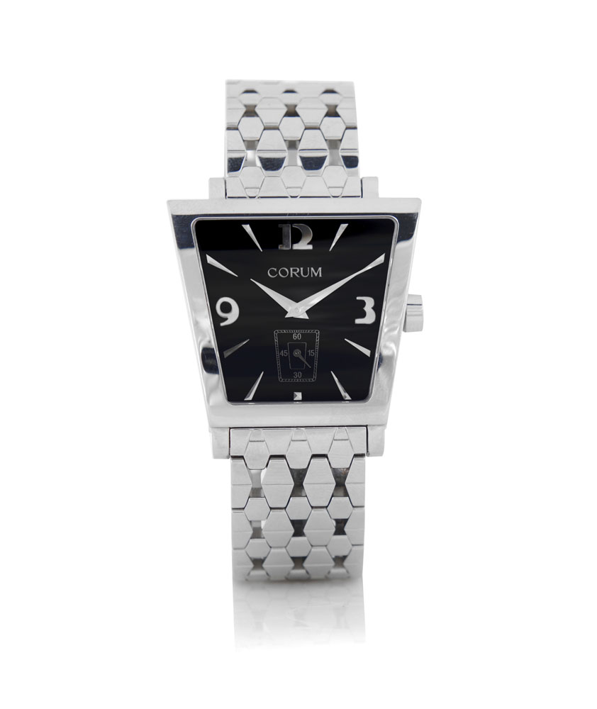 C. trapezoidal, stainless steel with case back secured by screws and sapphire crystal. D. black with applied indexes and Arabic numerals, subsidiary seconds. M. quartz. Stainless steel bracelet with hidden clasp. Dial, case, movement and bracelet signed. Accompanied by Corum box.