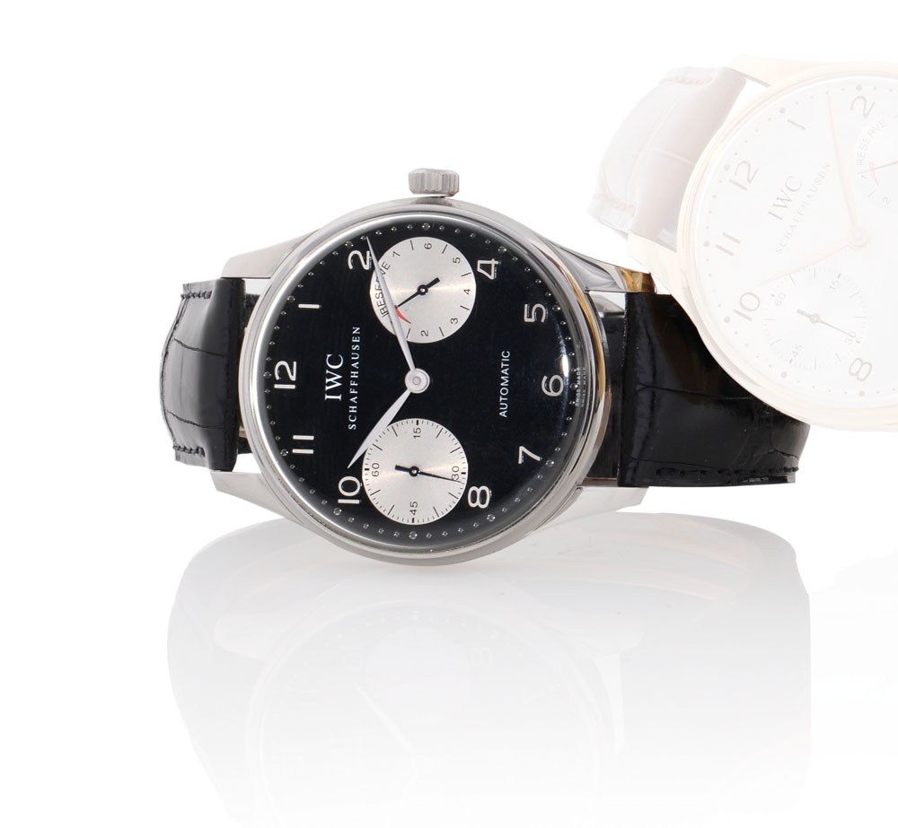 C. stainless steel with transparent case back. D. bicolor black and silvered with applied Arabic numerals, seconds at 9 and power reserve, 7 days, at 3. M. self-winding. Dial and movement signed, case numbered. Accompanied by IWC strap, stainless steel buckle, box and certificate dated 02/2003.