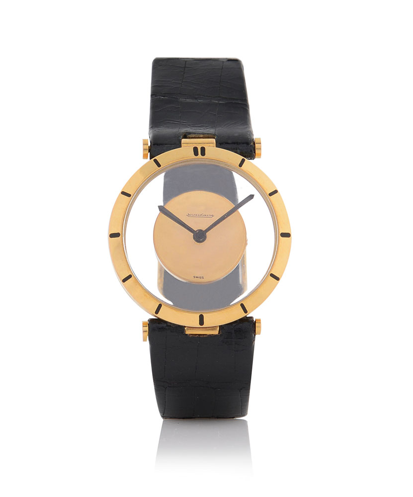 C. 18K yellow gold, case back secured by screws with winding crown to the reverse, bezel with painted indexes. D. transparent crystal, at the centre a small gold plated dial. M. manual winding. Dial, case and movement signed.