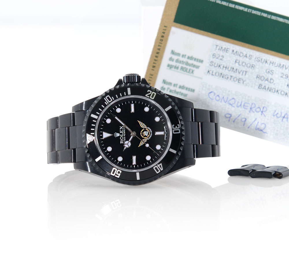 C. in acciaio trattato nero con simbolo Conqueror e numero di serie limitata incisi sul fondello e corona a vite, lunetta graduata girevole e vetro zaffiro. Q. nero con indici appliati e lancette luminescenti, simbolo Conqueror smaltato a ore 6. M. a carica automatica. Quadrante, cassa, movimento e bracciale firmati. Completo di astuccio con cinturini di ricabio, certificato di serie limitata e certificato originale Rolex del 09/12.