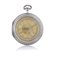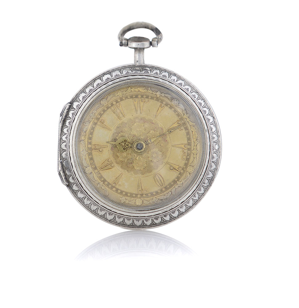 C. in argento liscia entro copricassa in argento interamente inciso con trofeo di strumenti musicali al centro. Terza cassa da viaggio in metallo ed ottone con incisioni sul fronte, profilo e retro rivestiti in pelle. Q. in argento dorato con decori ed indici turchi a rilievo. M. firmato con scappamento a verga, carica a chiavetta.