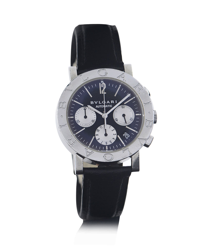 C. stainless steel with logo engraved on bezel, rectangular buttons and sapphire crystal. D. bicolor black and silvered with applied indexes and Arabic numeral, 30 minute and 12 hour registers, date between 4 and 5. M. self-winding. Accompanied by Bulgari strap, stainless steel buckle, box and certificate dated 06/2002.