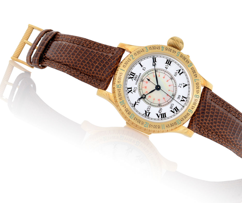 C. solid, 18K yellow gold with hinged case back, graduated and revolving bezel. D. white with painted Roman numerals, inner ring calibrated for 180 degrees with painted Arabic numerals, centre rotating mother-of-pearl disc and seconds. M. manual winding. Dial, case and movement signed. Accompanied by Longines strap, buckle, box, certificate dated 07/1991.