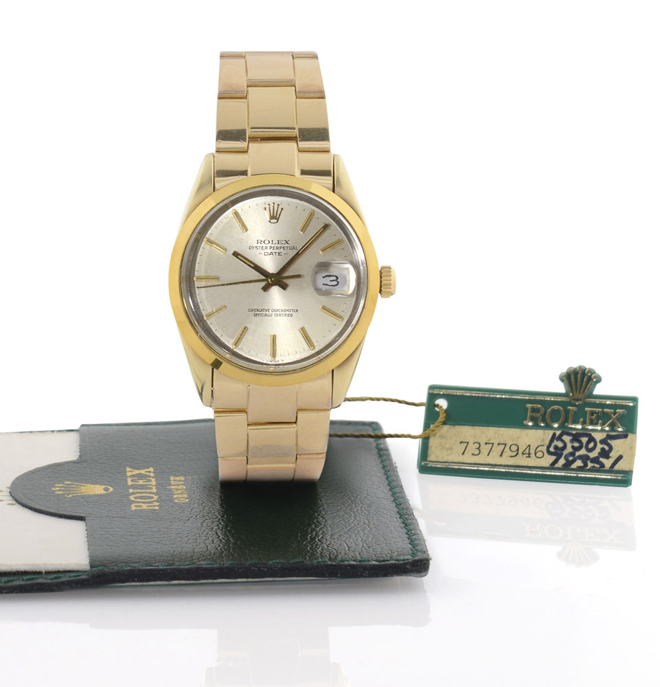 C. n. 7377946 laminata oro giallo con fondello in acciaio e corona a vite. Q. argentato con indici applicati, secondi al centro e data al 3 (scatto rapido). M. a carica automatica. Bracciale Oyster laminato oro giallo. Quadrante, cassa, movimento e bracciale firmati. Completo di certificato originale.