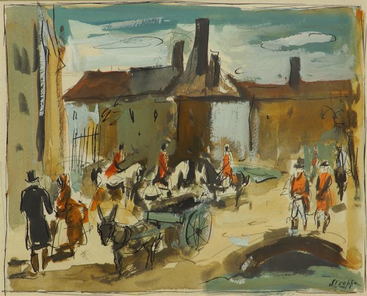 STROPPA LEONARDO Torino 1900 - 1991 "Partenza per la caccia" 18x23 acquerello...