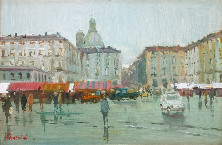 MARCHINI PAOLO ALBERTO Torino 1929 - 1977 "Torino - Porta Palazzo" 13x20 olio...