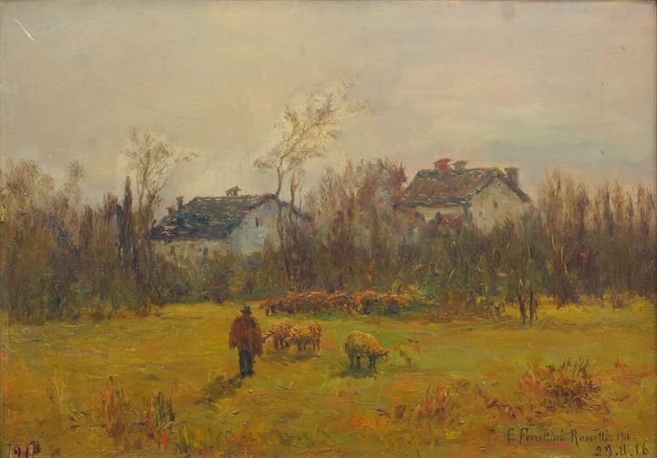 FERRETTINI ROSSOTTI EMILIA Torino 1866 - 1950 "Al pascolo" 1916 31x44,5 olio...